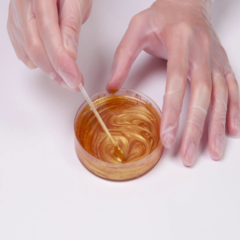 3. Mešanje: ◦ Polako i temeljno pomešajte metalik pigmente sa smolom. Pokušajte da izbegnete stvaranje mehurića vazduha u smoli prebrzim mešanjem jer oni mogu ostati u završnoj površini. Preporučuje se polako mešanje kako bi pigment bio ravnomerno raspoređen i kako se ne bi ubacilo previše vazduha u smešu. ◦ Pripazite da metalik čestice u smoli ostanu ravnomerno raspoređene. U suprotnom, mogu se nakupljati i stvoriti nesrazmerne svetlosne efekte ili neravnomerno prekrivene površine.